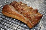 たとえば、ベーコン。月ノ輪はお肉も安心な純国産にこだわります。その豚ばら肉を一昼夜塩漬けし、塩抜き後さらにピックル液に3〜5日(季節により変わります)漬けて熟成。その後自ら採ってくる山桜のチップと手作り燻製器で6〜8時間かけて造ります。そんな手間を惜しまないのは市販品の調味液に漬けただけの燻製と言えない物とは明らかに違う、本物の美味しさをお客様に提供したいからです。
